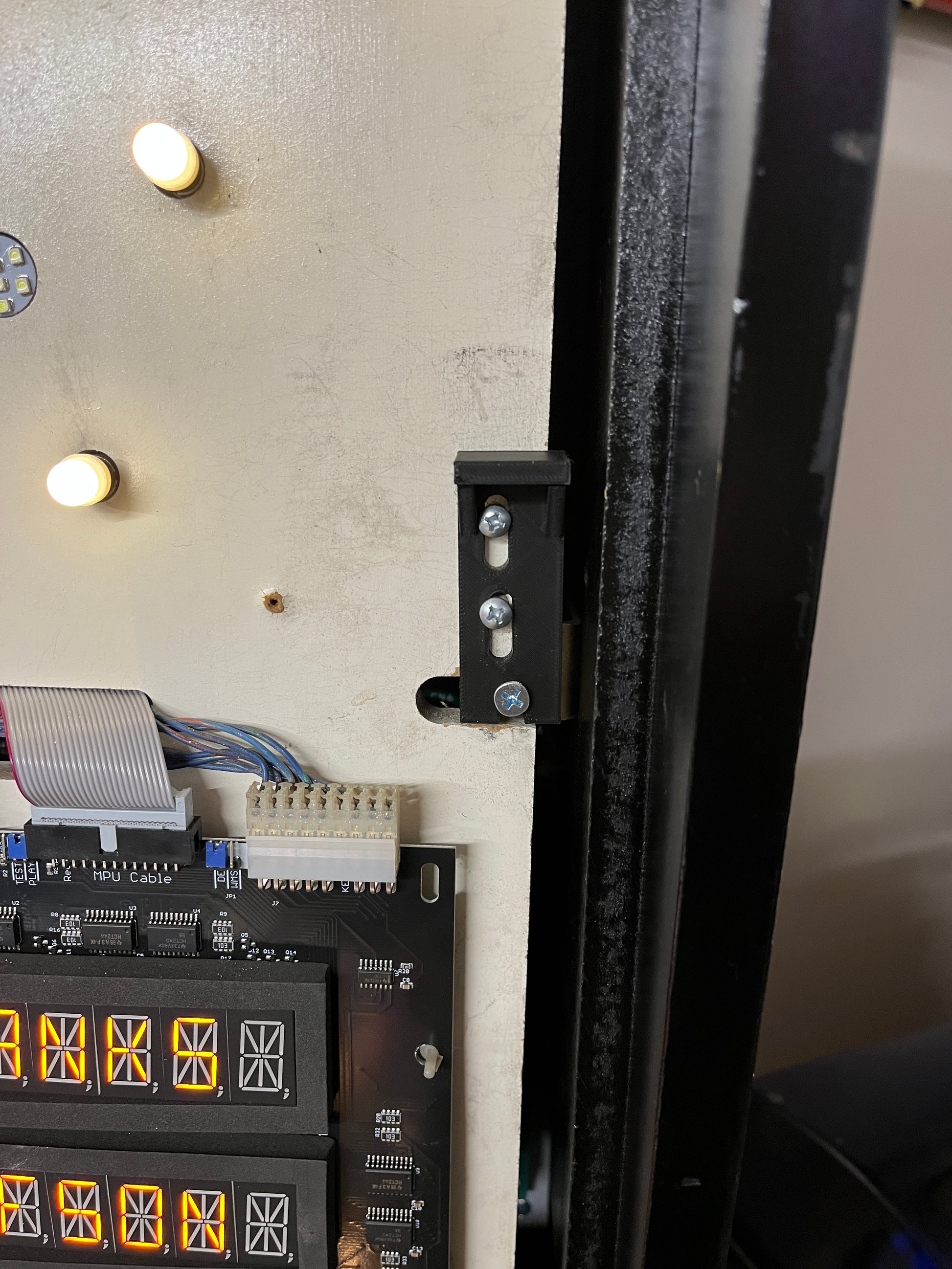 Reproduction of the missing sliding door latch on Data East back door. Pictured on a The Simpsons, that was missing on my machine. Screws not included.